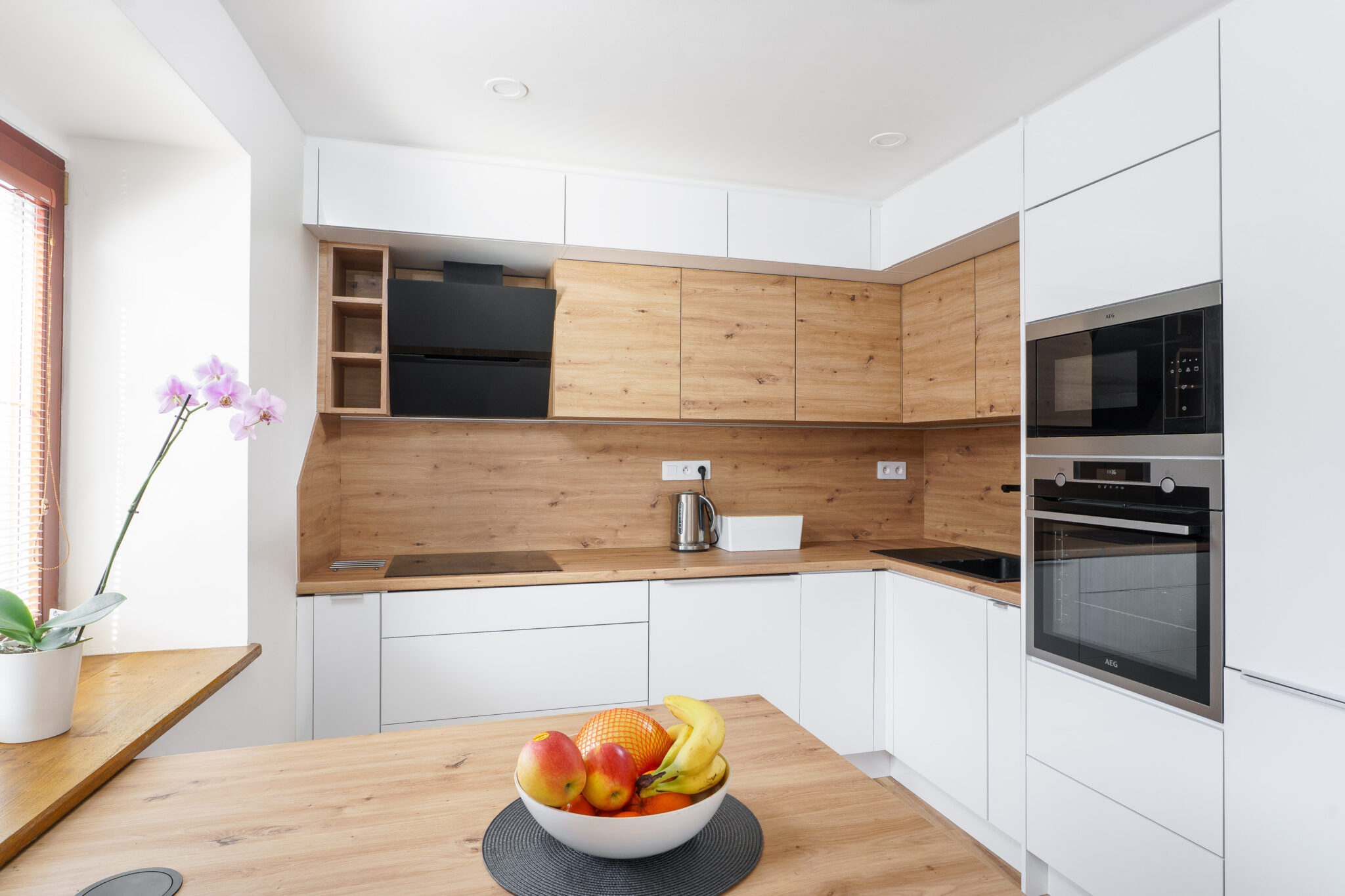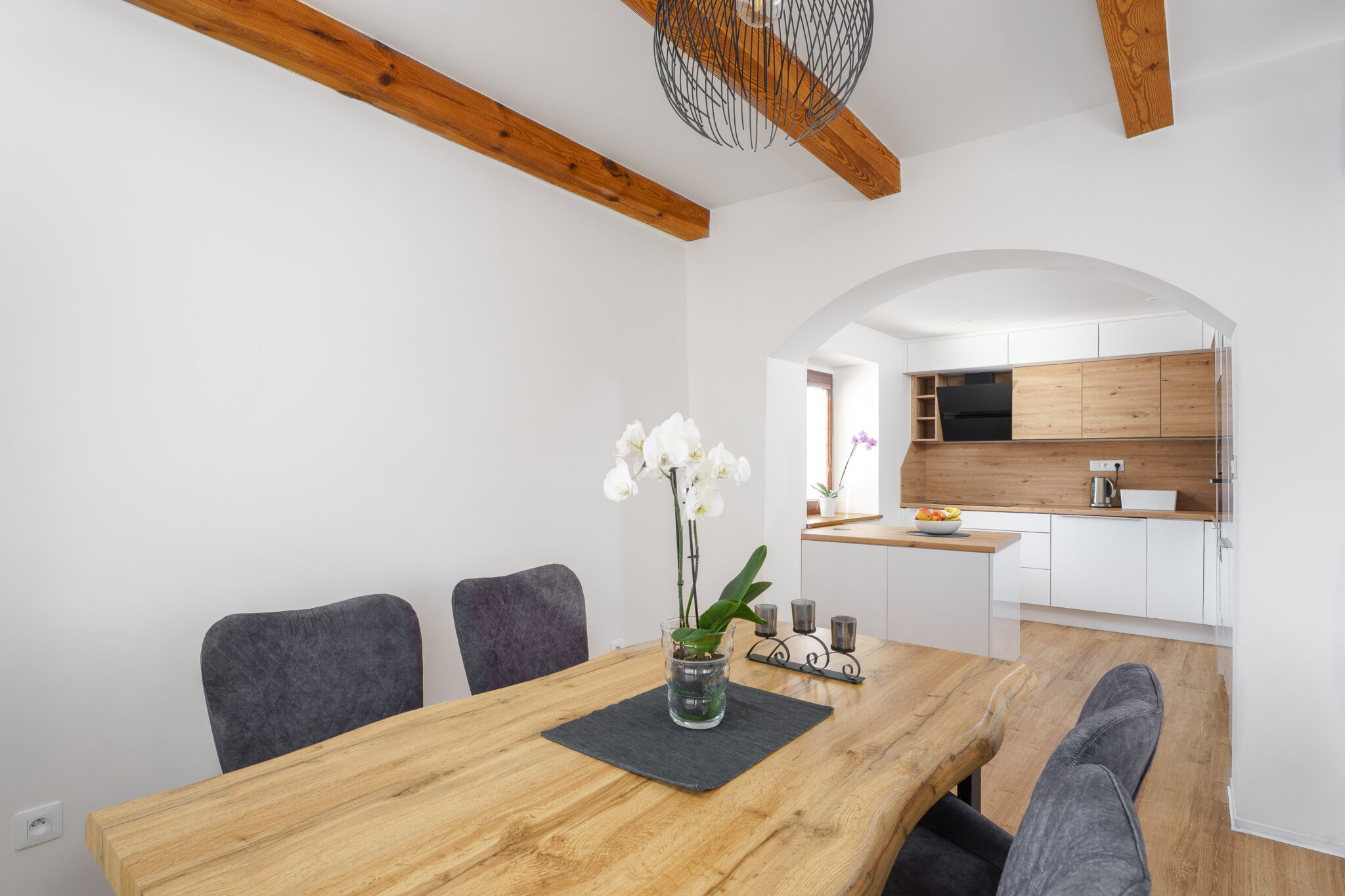 Výstavba rodinného domu ve Staré Boleslavi kombinuje čisté skandinávské linie s přírodními materiály a důrazem na maximální světelný komfort. Dominantou interiéru jsou odhalené dřevěné trámy v obývacím pokoji a jídelně, které v kontrastu s bílými stěnami vytvářejí útulnou atmosféru. Otevřený koncept přízemí propojuje kuchyni, jídelnu a obývací prostor do jednoho harmonického celku s přímým výhledem do zahrady. Celý dům vyniká promyšleným osvětlením, kvalitními materiály a funkčním využitím každého prostoru, což z něj činí ideální místo pro moderní rodinné bydlení.