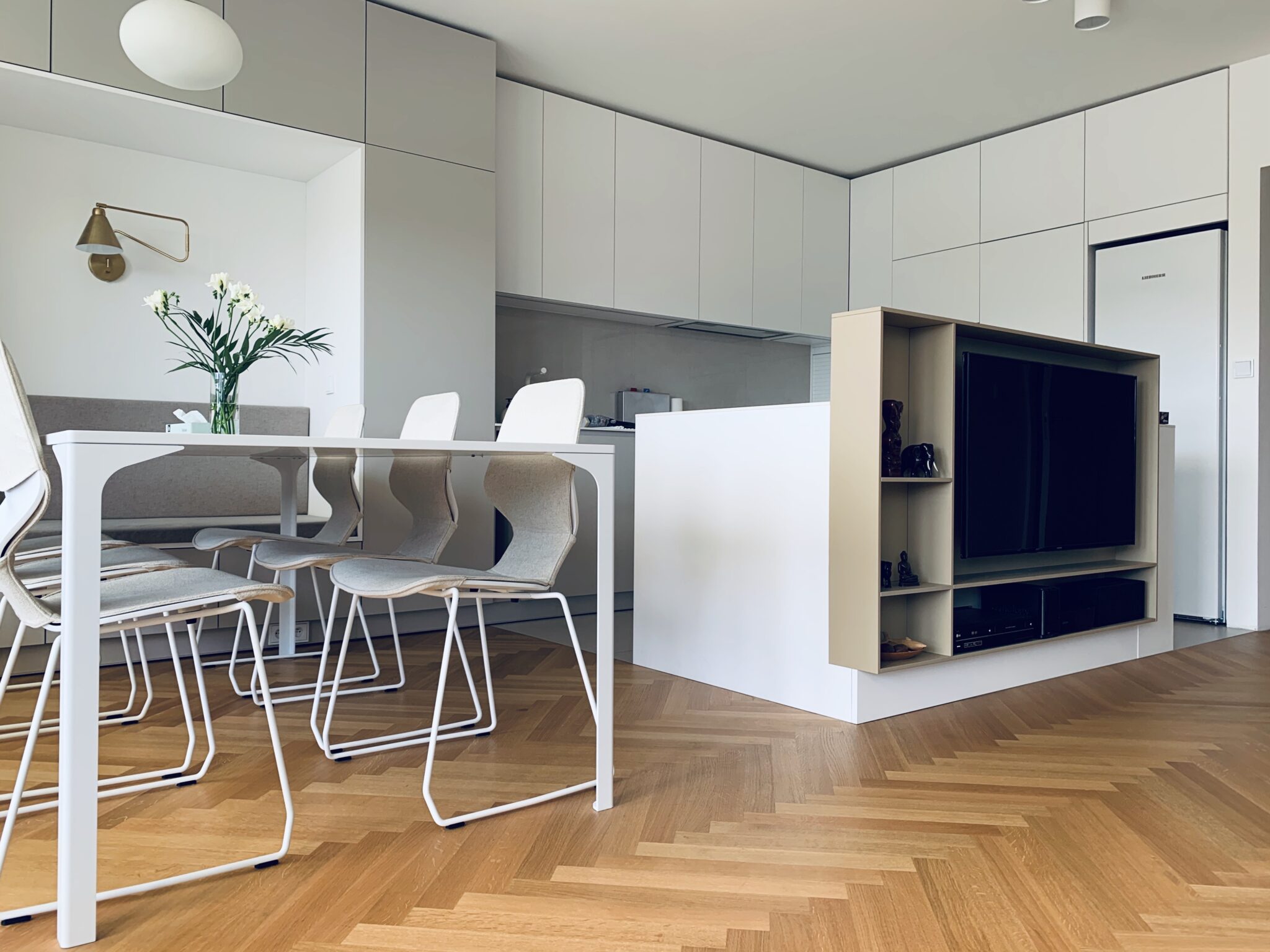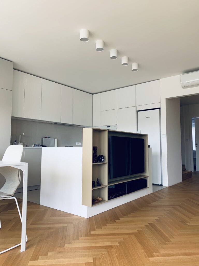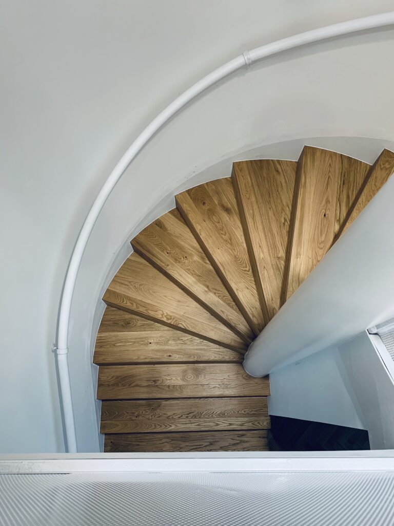 Při kompletní rekonstrukci mezonetového bytu se řešila nejen výměna původního ocelového schodiště za nové dřevěné, které lépe zapadlo do charakteru interiéru a zvýšilo jeho obytný komfort. Během realizace bylo nutné vyřešit řadu technických nástrah, zejména návaznosti na stávající konstrukce a statické požadavky.