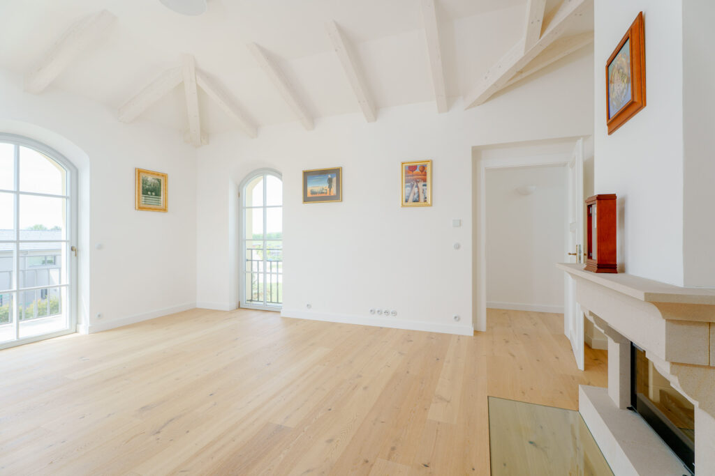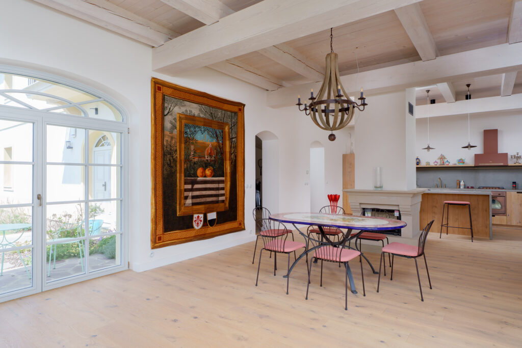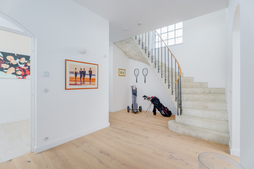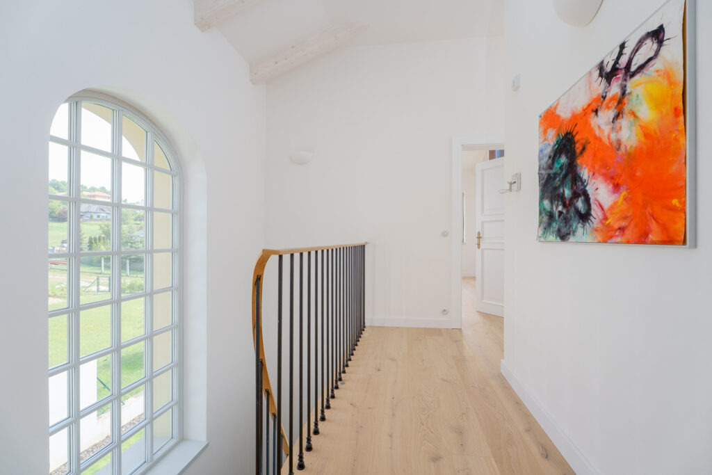 Interiéru dominuje obloukové schodiště s ručně ohýbaným dřevěným madlem z jednoho kusu. Výrazným prvkem je také pískovcový krb, umístěný v centrální části obytného prostoru propojeného s kuchyní. Za pozornost stojí rovněž pohledové trámové stropy s dřevěným podbitím, které dotvářejí autentickou atmosféru domu.