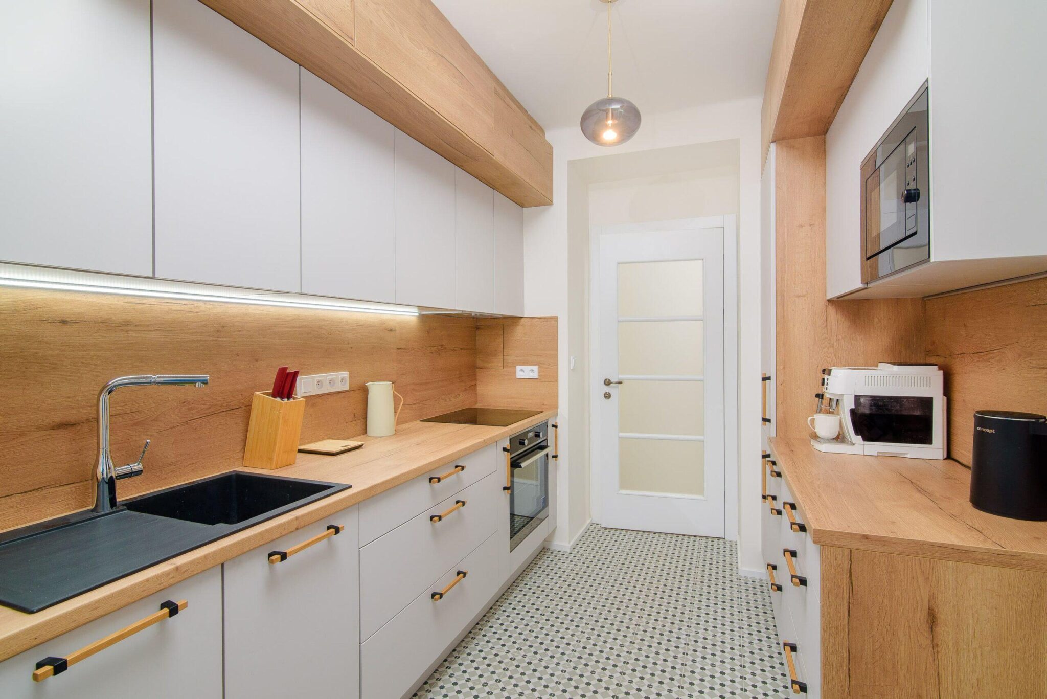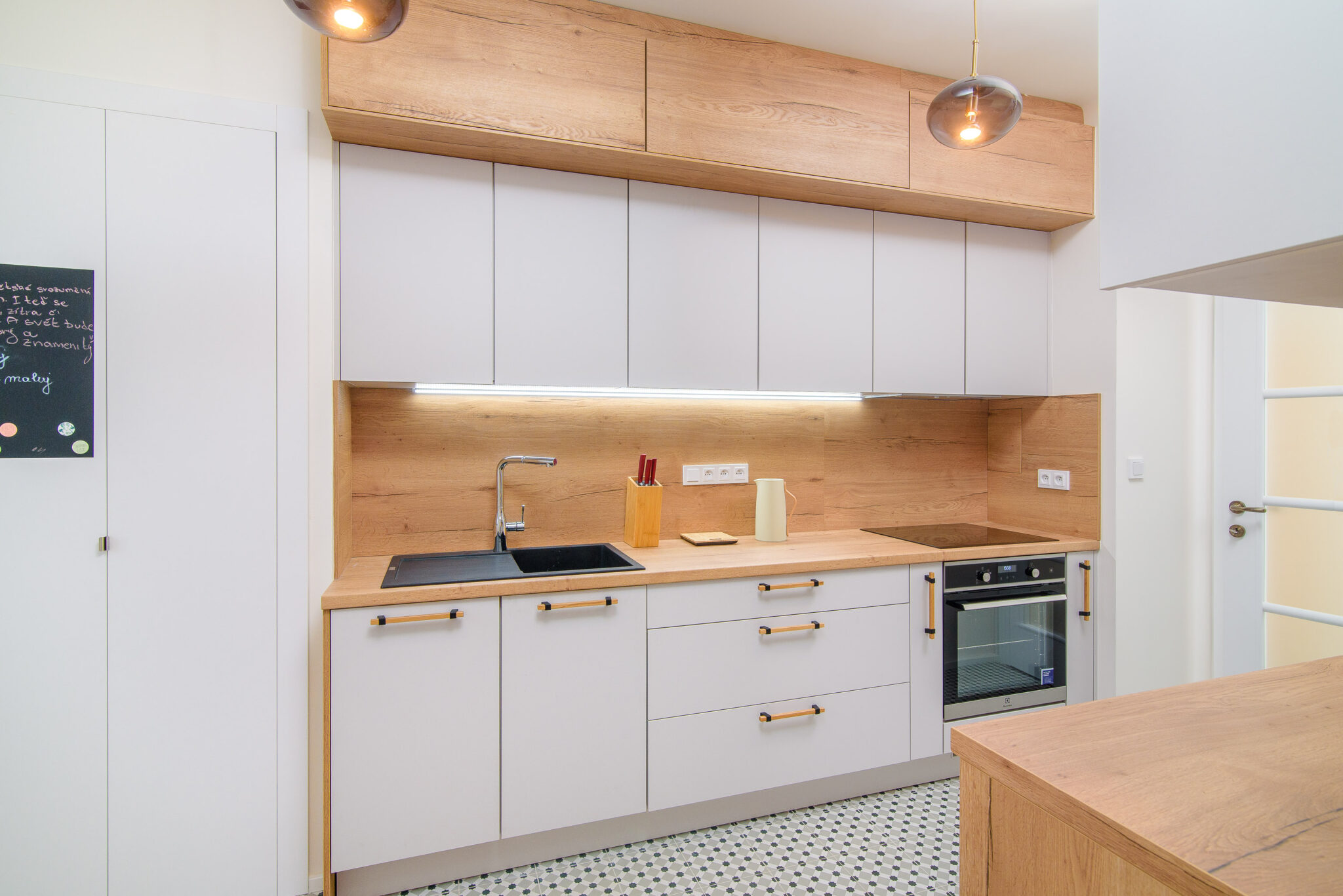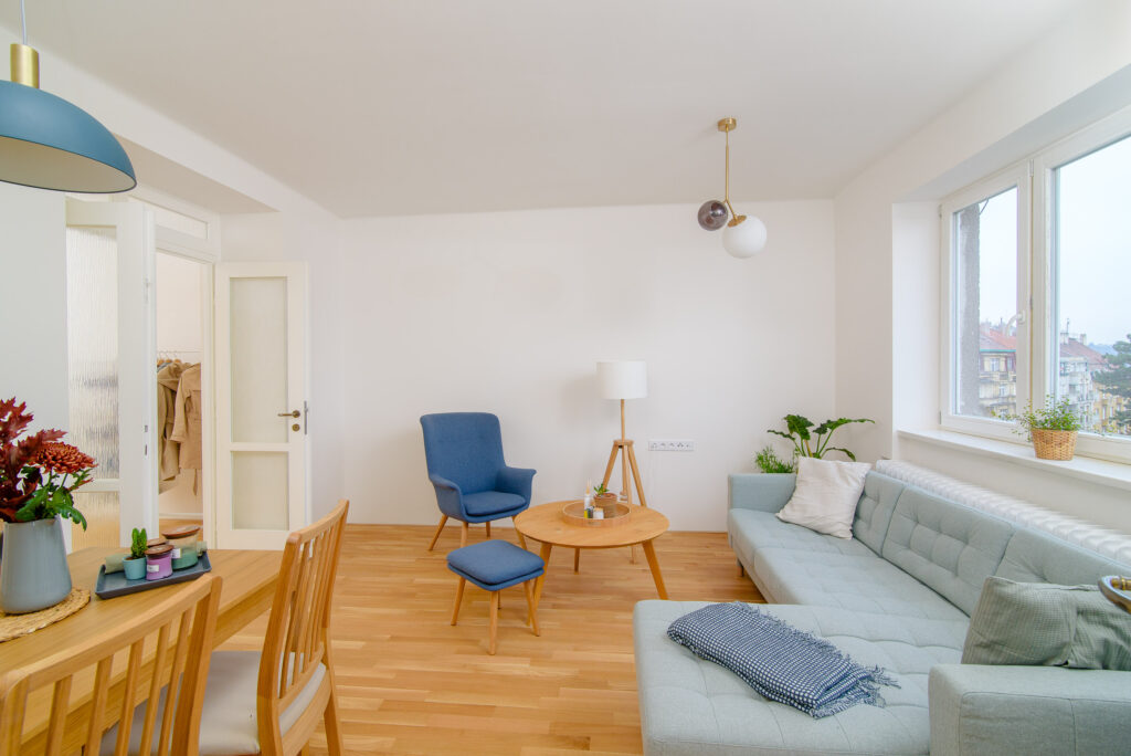 Rekonstrukce bytu od A-Z. Kompletní rekonstrukce bytu na Praze 6, Bubeneč. V bytu byla realizována nová kuchyň, koupelna, obývací pokoje a společné prostory.