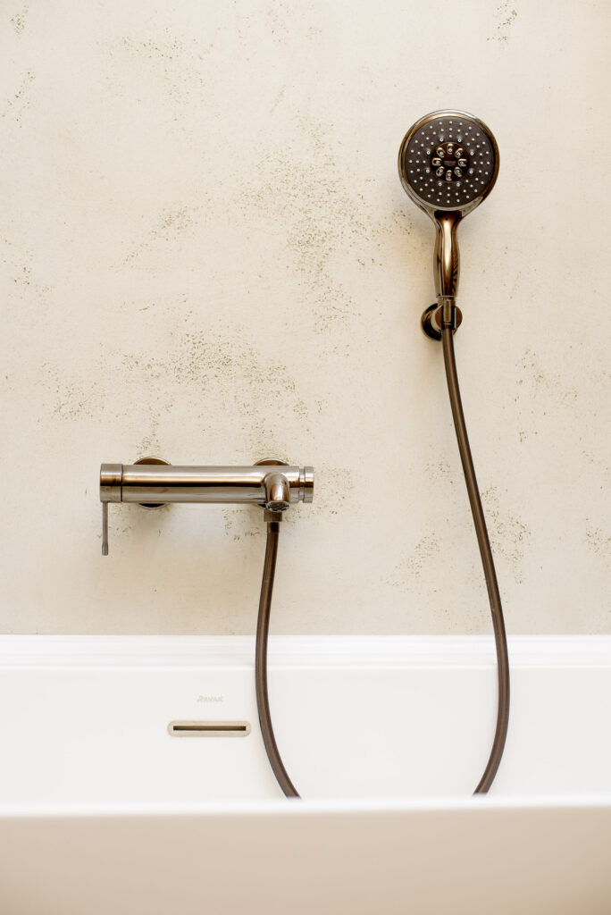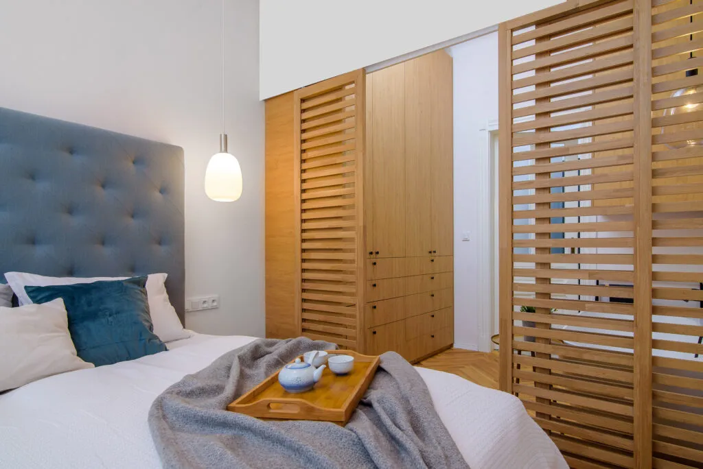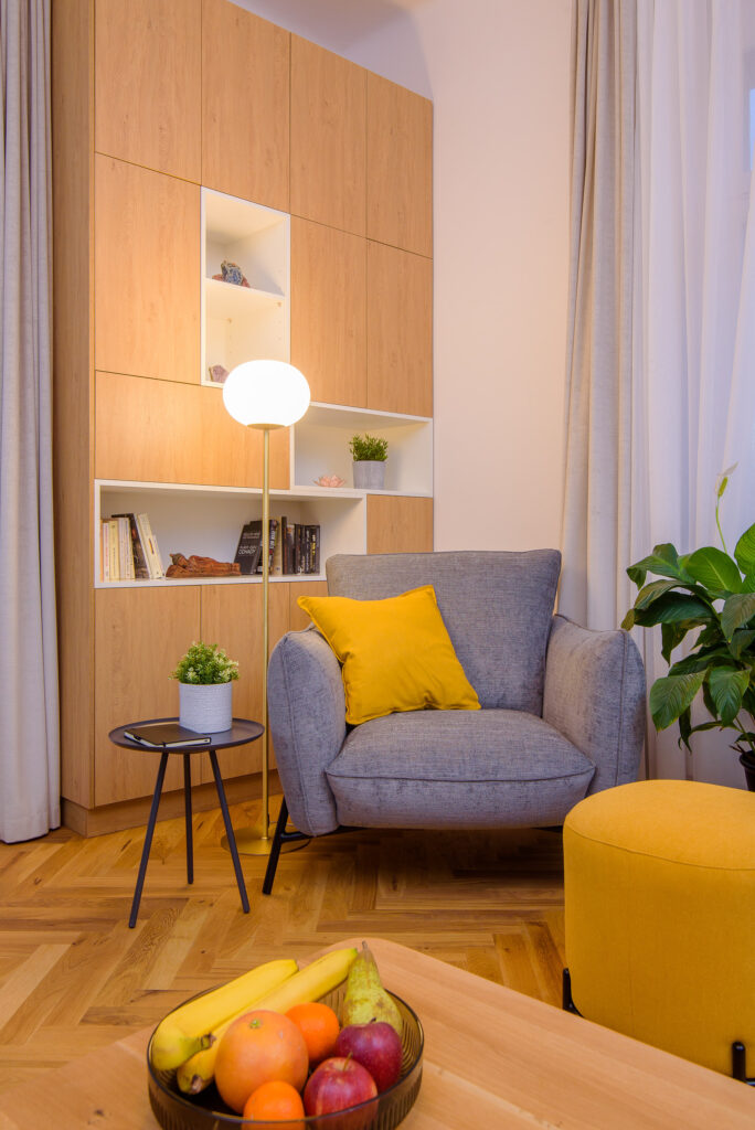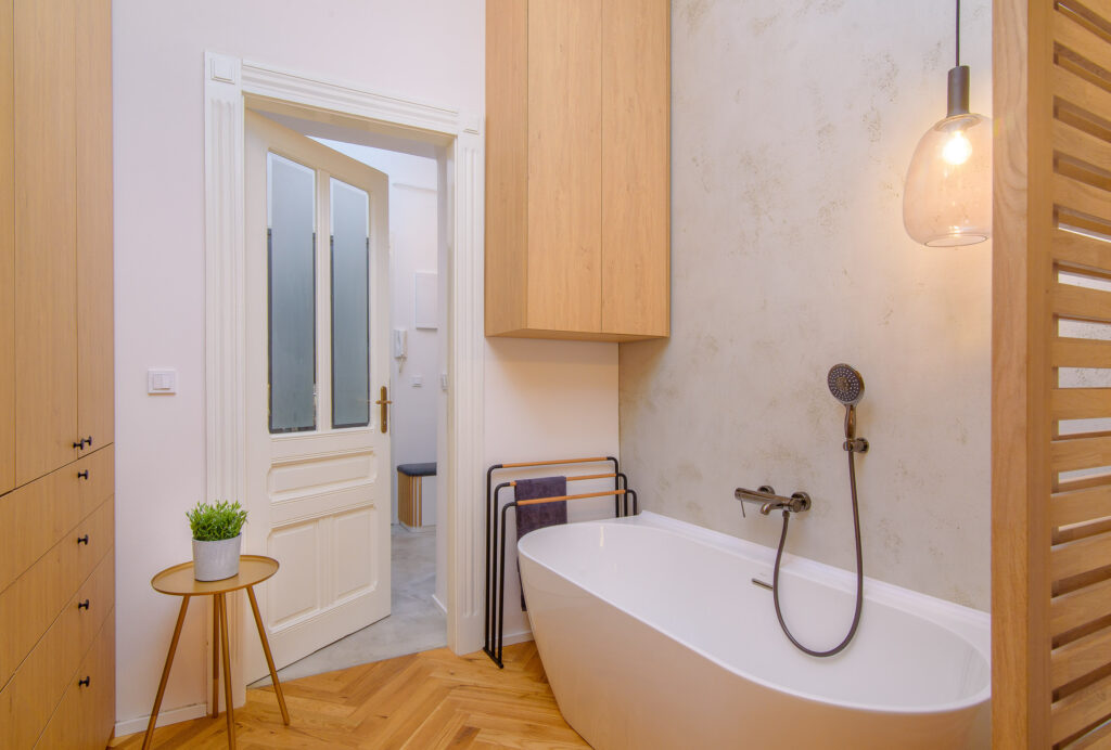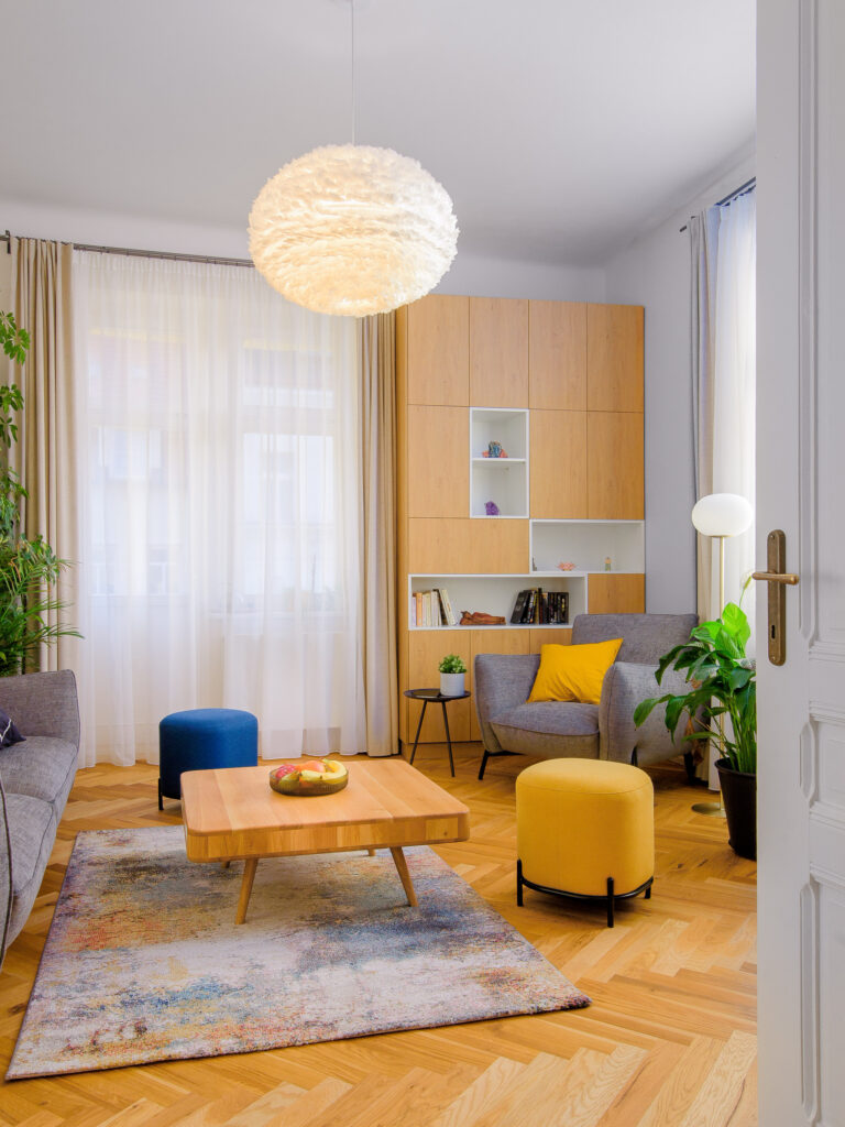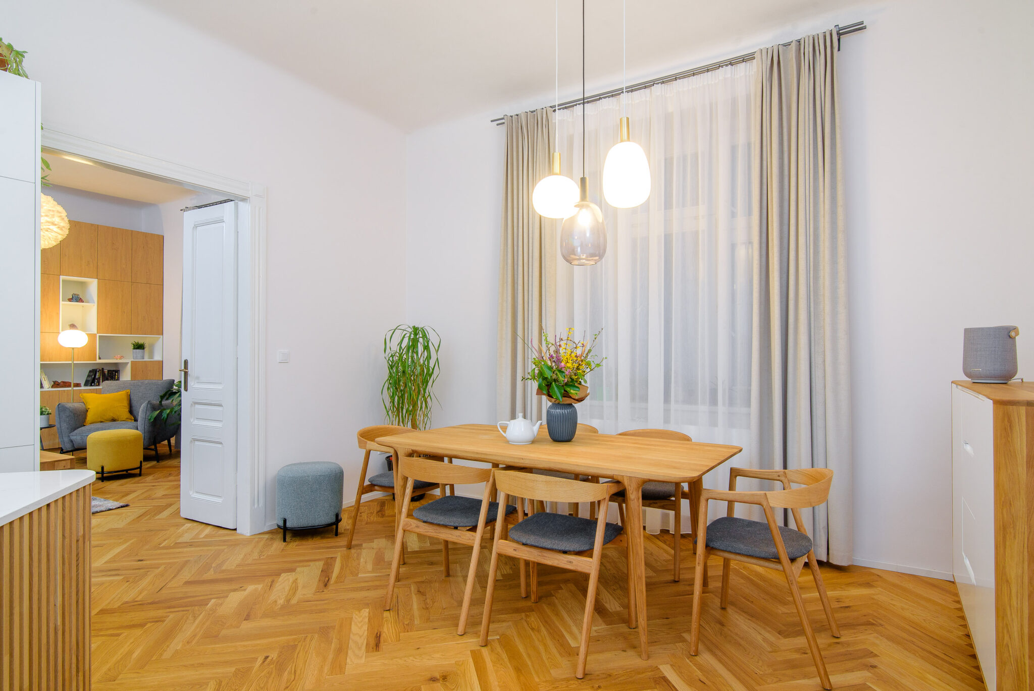 Rekonstrukce činžovního bytu z 19. století s důrazem na moderní komfort a zachování historického kouzla. Při úpravách došlo ke kompletní výměně skladby podlahy. Netradičním prvkem interiéru je volně stojící vana, kterou od ložnice elegantně oddělují dřevěné posuvné dveře.