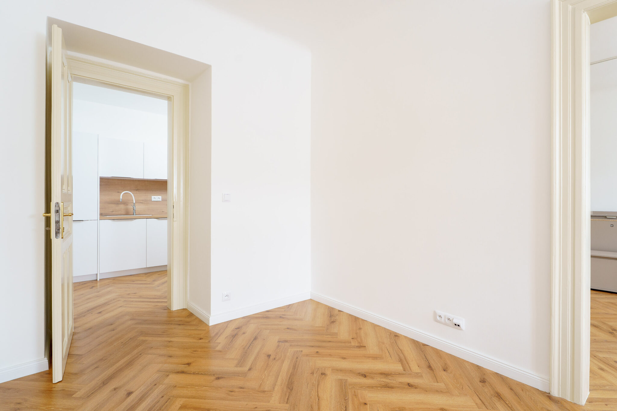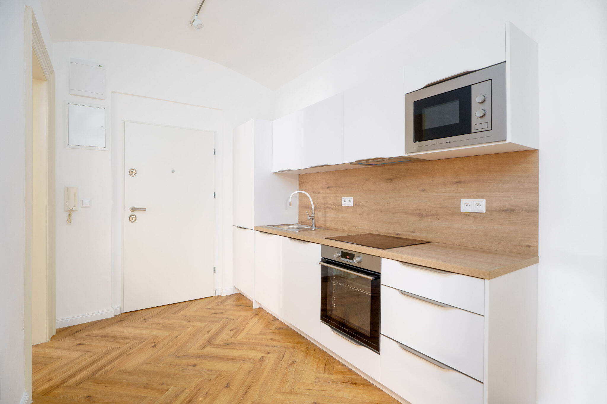 Zdařilá rekonstrukce prostoru ve sníženém podlaží na Praze 2. Hlavní dominantou interiéru je pečlivě zrenovovaná původní parketová podlaha. Praktickou zajímavostí je zádveří, které bylo chytře navrženo s vyhrazeným „parkovacím místem“ pro kočárek. Celý projekt je ukázkou toho, jak lze funkčně a vkusně využít každý metr čtvereční městského bydlení.